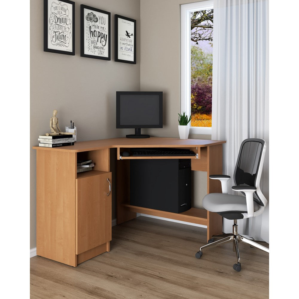 Biroul SU 14 este un birou pe colt, prevazut, pe latura din stanga ( lungime =120cm),este prevazuta cu 1 corp cu 3 rafturi si 1 usa . Latura din partea dreapta ( lungime 90cm ),cu suport glisant pentru tastatura si un raft depozitare in partea inferioara .