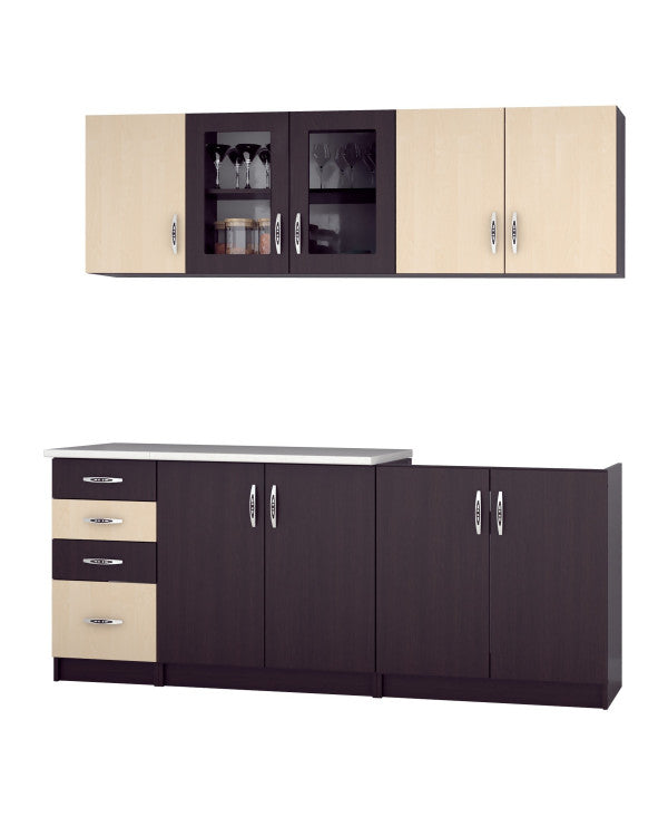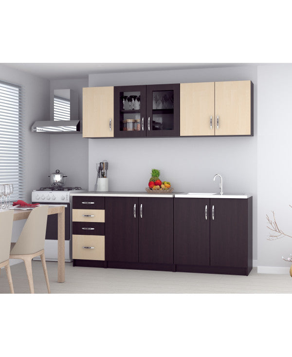 - Bucataria este realizata din PAL Melaminat Wenge + Mesteacan cantuit cu ABS. Partea inferioara este formata dintr-o masca de chiuveta de 80cm, un corp de 80cm cu 2 usi, un corp de 40cm cu 4 sertare si o usa si blat termorezistent ( blat pentru fiecare corp in parte ), mai putin pentru corpul de masca. In partea superioara, bucataria este formata dintr-un corp de 80cm cu 2 usi, 1 corp vitrrina de 80cm cu 2 usi ( cu geam sablat ) si un corp de 40cm.