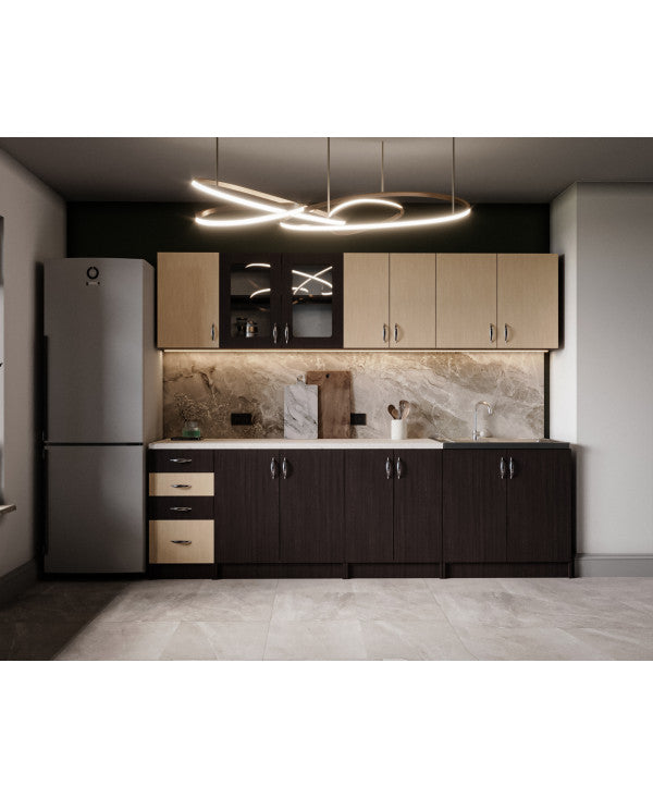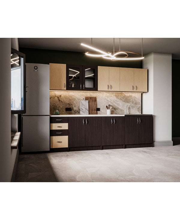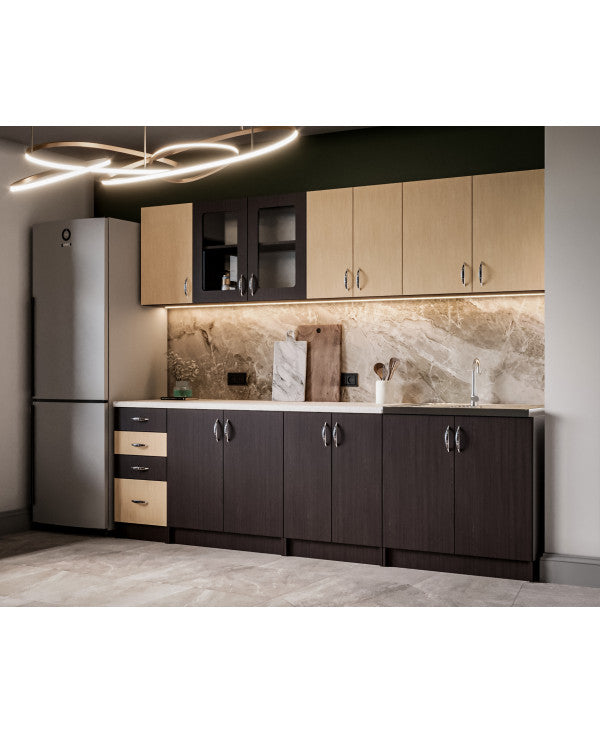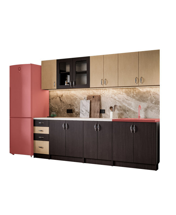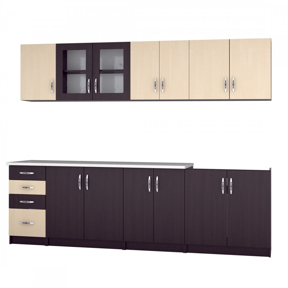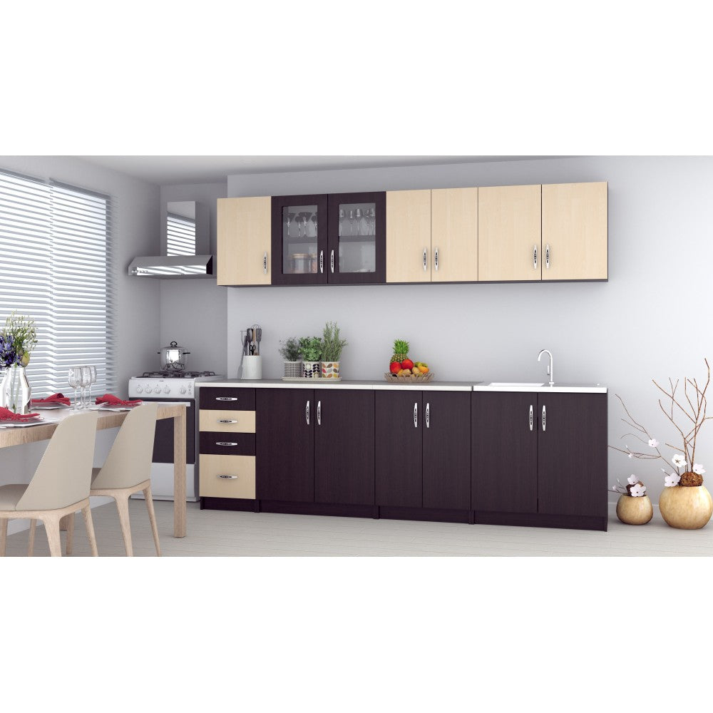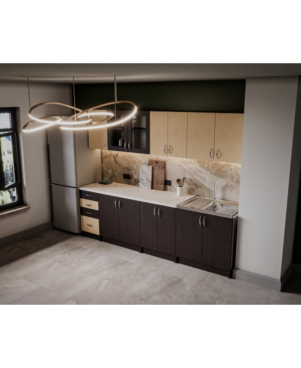 Bucataria este realizata din PAL Melaminat Wenge + Mesteacan cantuit cu ABS. Partea inferioara este formata dintr-un corp de 60cm cu 2 usi, o masca de 80cm, un corp de 80cm, un corp de 40cm cu 2 sertare si blat termorezistent ( blat pentru fiecare corp in parte ) mai putin la corpul masca de chiuveta. Partea superioara este formata dintr-un corp de 60cm cu 2 usi, un corp de 80cm, o vitrina de 80cm cu 2 usi ( cu geam sablat ) si un corp de 40cm.