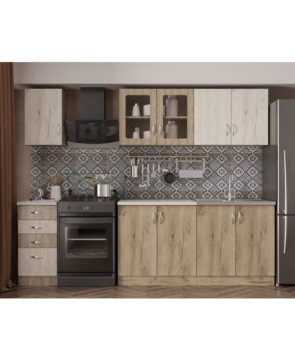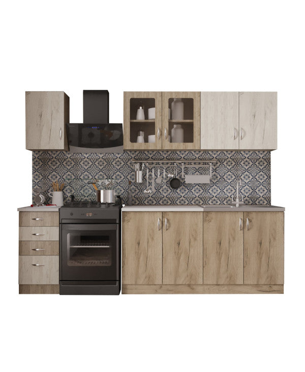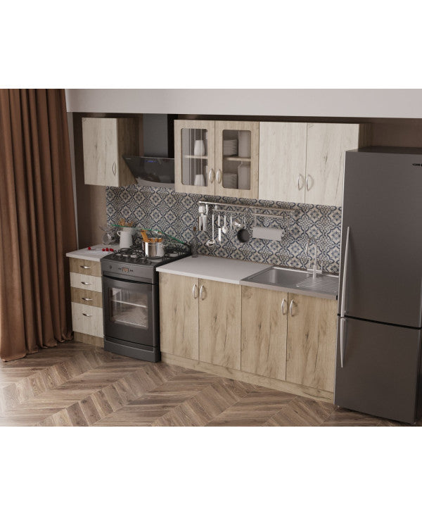 - Bucataria este realizata din PAL Melaminat cantuit cu ABS. Partea inferioara este formata dintr-o masca de chiuveta de 80cm, un corp de 80cm cu 2 usi, un corp de 40cm cu 2 sertare si o usa si blat termorezistent ( blat pentru fiecare corp in parte ), mai putin pentru corpul de masca. In partea superioara, bucataria este formata dintr-un corp de 80cm cu 2 usi, 1 corp vitrrina de 80cm cu 2 usi ( cu geam sablat ) si un corp de 40cm.