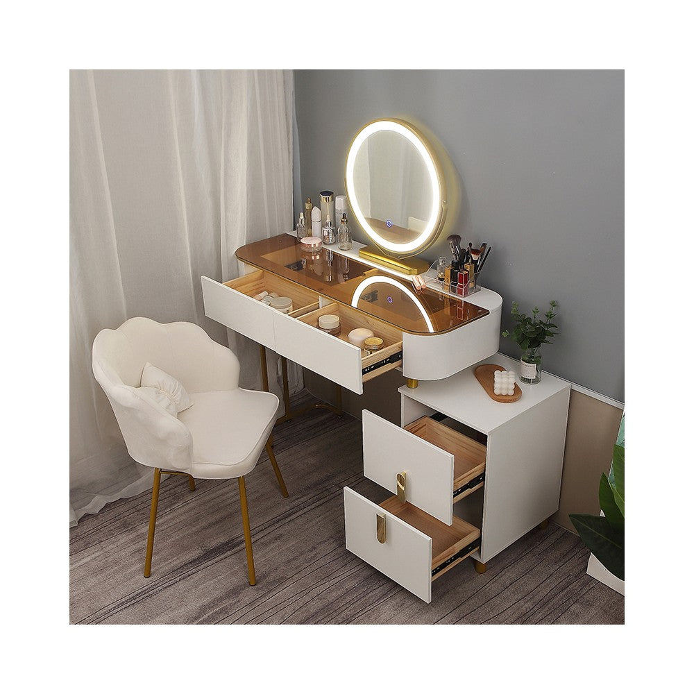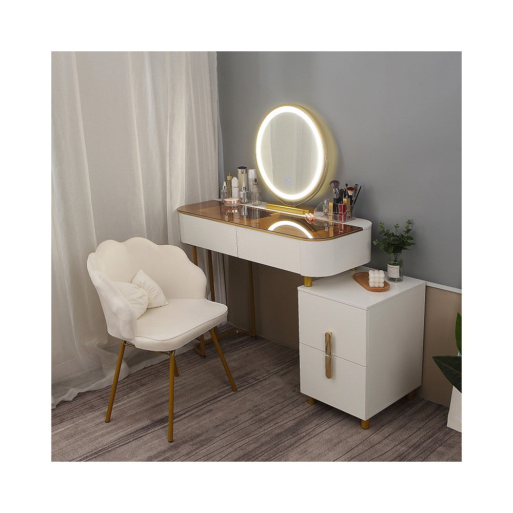 ● Această masă de toaletă are 2 sertare și un dulap de depozitare, oferind suficient spațiu pentru a vă ajuta să vă puneți toate produsele de îngrijire a pielii; cosmeticele, bijuterii, uscător de păr, ondulator și alte articole de înfrumusețare. Unul dintre sertarele mari are compartimente suplimentare care pot fi împărțite pentru depozitarea bijuteriilor.